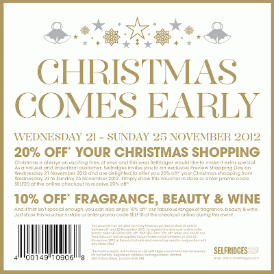 Roll up, Roll up those generous peeps at Selfridges are offering 20% off a huge amount of goods for the next 5 days! Starting today you can buy good in store by using printing out the voucher below or online using the codes. The perfect chance to do some Christmas shopping and treat yourself of course! Lovely…