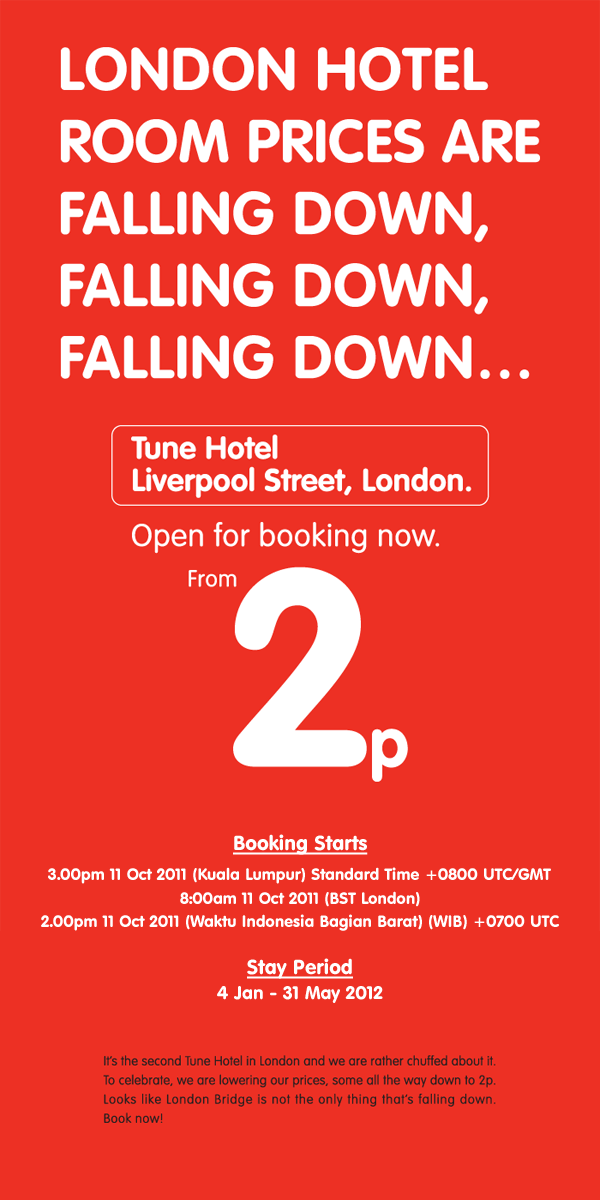 Bookings open tomorrow (Tues Oct 11th) at 8am. Simply log on to www.tunehotels.com/uk and select a date to stay between Jan 4th and May 31st next year. No strings attached although you will need to pay for all you “add ons”. We checked out the Tune Westminster earlier this year and we were impressed.