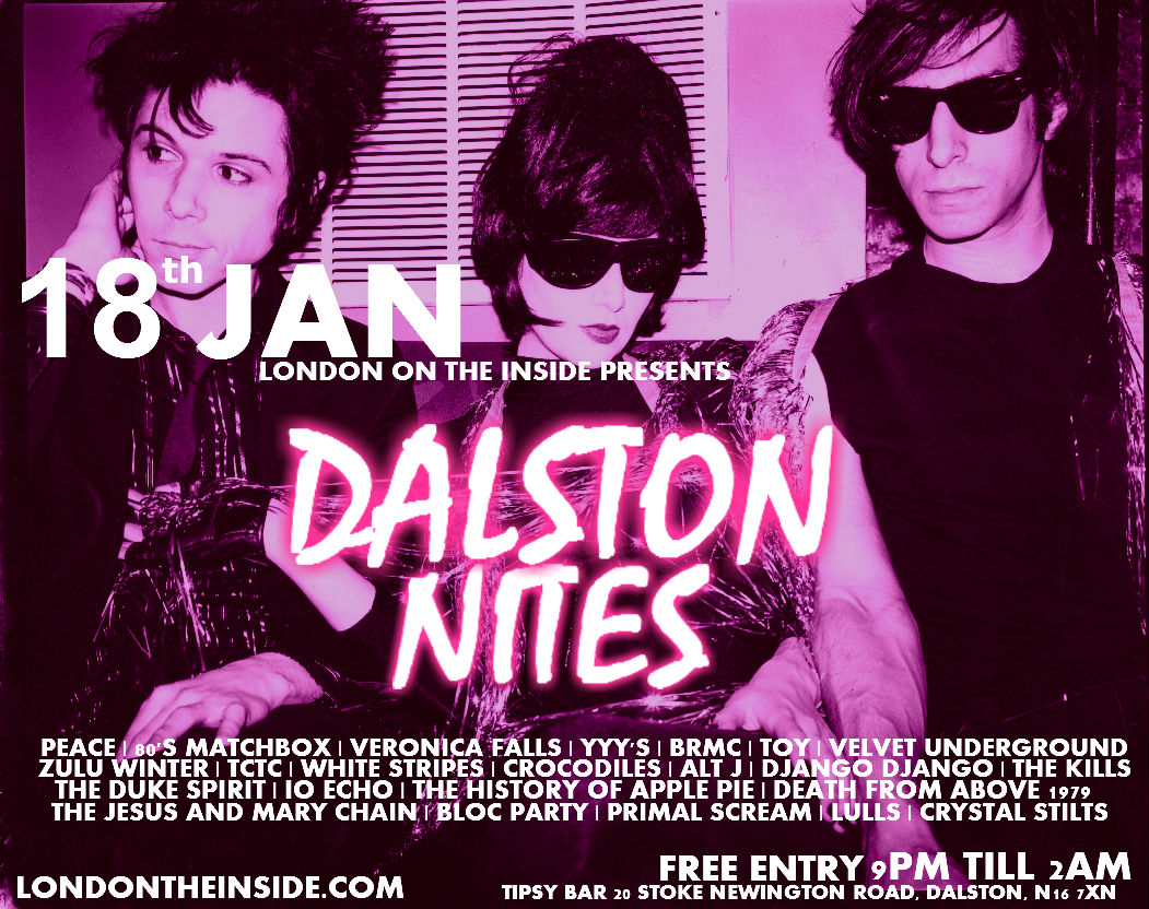 2013 and we’ve got BIG plans this year, the first of which is to kick off our monthly club night ‘Dalston Nites’ where we will be raising the rock n roll, indie and alternative pulse in the East end. On the third Friday of every month in Tipsy we invite you to come and have a slightly riotous evening drenched in good music, old and new. Further more its bloody FREE so brave the cold and come out to play…
