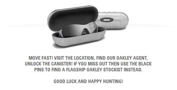 Join the Oakley Europe National Treasure Hunt beginning on tomorrow, by logging on to the Oakley Facebook page. A bunch of Oakley Heritage products will be stashed in six secret design inspired locations across the UK and it’s up to you to find them. The clues will be disclosed on the facebook page along with a interactive map. Once the final clue is out the race for the prizes begins.