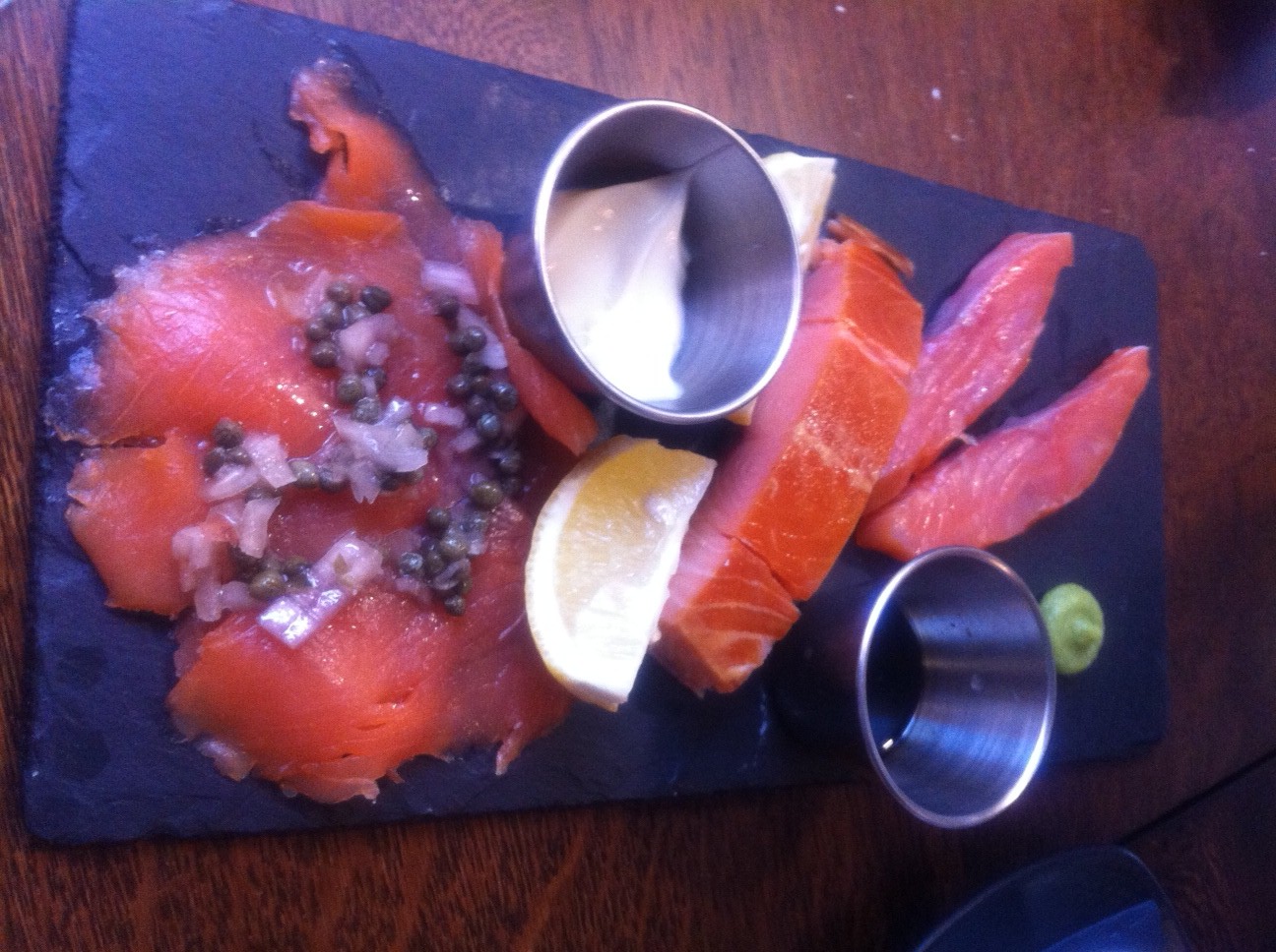 We started with a basket of freshly baked, warm bread, quirkly served in a small wooden basket. Pan-fried Chilli & Garlic King Prawns served in a deep pot of lemon oil and Loch Fyne Smoked Ashet, a generous trio of salmon, all served differently with individual dips.