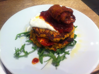 Inside the cafe has a good selection of seating with windows looking onto a quiet square and outdoor tables should the weather permit. We visited for breakfast and tried the Corn fritters stacked with crispy bacon, fresh rocket, slow roast tomatoes, chilli jam and crème fraiche. The dish was made up of juicy slow roasted tomatoes sandwiched between two thick pancake style fritters which sat on top of a mound of rocket and were finished off with a cluster of crispy bacon – definitely not for the faint hearted this is one filling breakfast.